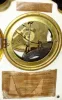 The white china case is intact with just the expected light crazing. There is some tarnish on the brass dial and cast bezel; the beveled glass is fine. On the back are two original paper labels; model number and instructions. The movement ticks, with its jeweled exposed escapement, and strikes but could use cleaning. Ht 12"