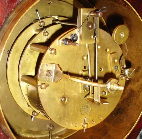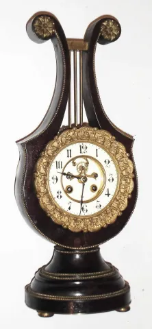 French, Marti and Cie, 8 day, time and strike, silk thread suspension lyre form mantel clock, c1850. Mahogany and gilt mountings case in nice condition in an old finish. There is some gilding remaining on the case. Original porcelain dial is perfect and the hands are original. Movement is signed. Ht 17"