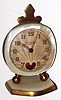 Fleus de Lys de Paris Swiss 30 hour miniature alabaster and brass beating heart time piece with original case, c1920 This little novelty is in very good original condition with old surface on the brass, white marble base and dial surround, engine turned dial, and colored hands and numbers. The red leather case, with two hinged doors, also is in remarkably good shape. The little brass disk swings briskly in the heart-shape opening. Ht of case 3"