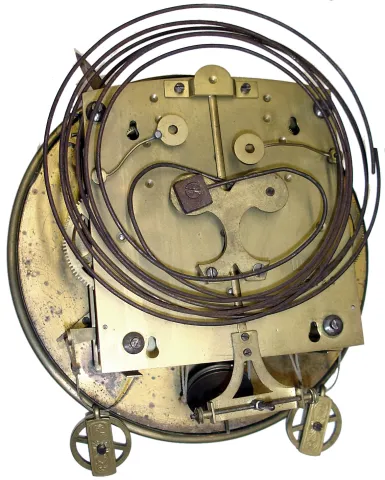The old finish is dry and dusty but this graceful case will restore without much effort. Top and bottom finials are missing. Nice quality 3 train movement, with partially worn trademark of ...R.M.Co., numbers 100000 and 92222, and twin rear coil gongs, will need cleaning and new cords. One pulley is a solid replacement. Brass components are tarnished, porcelain dial has some hairlines and a few small losses showing copper below. Ht 40"