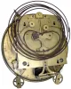 Vienna Regulator, walnut 3 weight quarter chiming 8 day wall clock with trademarked movement, c1880 The old finish is dry and dusty but this graceful case will restore without much effort. Top and bottom finials are missing. Nice quality 3 train movement, with partially worn trademark of ...R.M.Co., numbers 100000 and 92222, and twin rear coil gongs, will need cleaning and new cords. One pulley is a solid replacement. Brass components are tarnished, porcelain dial has some hairlines and a few small losses showing copper below. Ht 40"