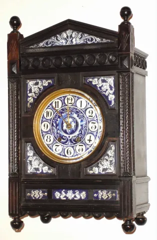 English ebonized wood and blue/white tile bracket clock with 8 day, time and strike French movement, c1880 Made in the "Aesthetic Movement" style, this architectural case retains it original finish, with minor wear, and undamaged tile inserts and dial with no losses. The thick beveled glass is fine. The square plate movement, marked "A.C&B, Paris", should be serviced. Ht 19"