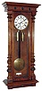 Gustav Becker, Freiburg Germany, walnut 2 weight time and strike Vienna regulator, c1886 There is a nice gloss finish on this well-made detailed case with matched-grain backboard, but the crest and base are absent. The white porcelain dial and beat scale are about perfect, and there is a shiny old patina on the brass bezel, weight shells and pendulum bob. The movement, with its two stamps showing the maker and the gold medal award, looks clean with new cords but may need minor service. Pulleys may be replacements. Despite the missing top and bottom, an impressive hanging clock. Ht 37"