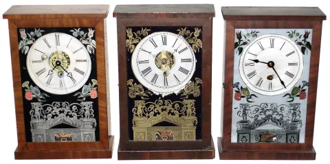 All have old painted dials, movements with mainsprings behind the back plates, colorful glass tablets but incorrect hands. The Beals has 2 good inside labels, a refinished case and tablet cracked top to bottom. The other clocks' surfaces and glasses are old and intact. They all tick. Hts 11"