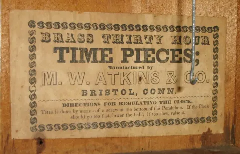 Clocks- 3 (Three) Connecticut 30 hour "cigar box" mahogany time pieces: Beals with alarm; Atkins with black/gold tablet; and unsigned; c1860 All have old painted dials, movements with mainsprings behind the back plates, colorful glass tablets but incorrect hands. The Beals has 2 good inside labels, a refinished case and tablet cracked top to bottom. The other clocks' surfaces and glasses are old and intact. They all tick. Hts 11"