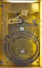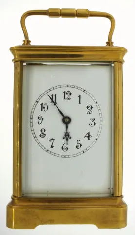 Polished brass case very good, left glass with chips at bottom, right glass missing small piece of lower right corner, back glass with chip at upper right corner, original movement running and striking, gilt decorated plates very good, replaced dial and hands. Ht. 7 1/8" to top of handle