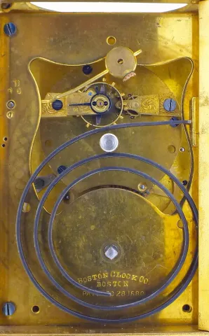 Boston Clock Co., Boston, Massachusetts, carriage clock, spring powered tandem winding time and strike movement, with gilt frosted time train plate, and fancy gilt bright polished and damascene back plate, signed Boston Clock Co., Boston Patd. Dec. 28