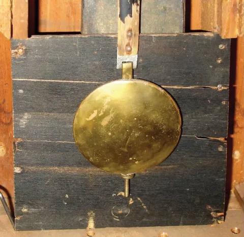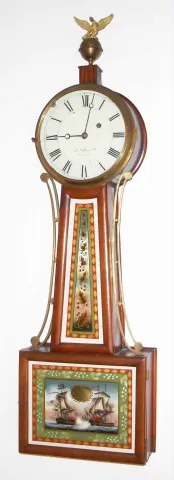 Massachusetts , 8 day, weight drive banjo or patent time piece, c1870 This mahogany banjo has been restored. Both tablets are modern. Based on the movement, wood pendulum rod and wood baffle in the case it appears that this was probably a Hatch. The dial appears to be original to the case with paint loss on the edge and the mounting pins. This clock has been altered to appear as an earlier Willard-style clock. It now has a dial with spurious signature of Aaron Willard, Jr., modern decorative tablets, brass bezel, side arms and eagle. The movement and pendulum suggest it was originally converted from an Attleboro-style clock with wood bezel and black and gilt glasses.. The hinge area was reparied when the brass bezel was installed. Ht 33 3/4"