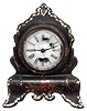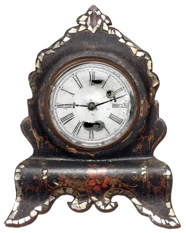 Terryville Manufacturing Company,Terryville, Conn., 30 hour iron front torsion pendulum mantel time piece, c1855 There is good MOP, faded paint, and complete wood backboard on this rare clock, The glass is old and bubbly, and the painted metal dial has small losses, especially near the hinge which probably was resoldered. The movement, stamped with the 1852 patent date, ticks with its dumbbell pendulum, but could use cleaning. See page 194 of Ly's American Clocks Vol.3 for this story. Ht 10 1/2"