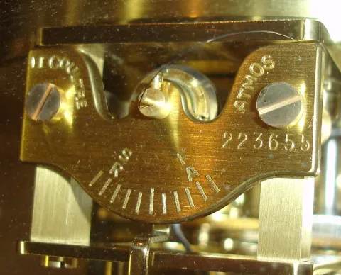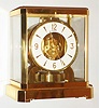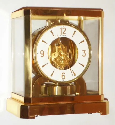 LeCoultre Swiss "Atmos" gold plate and glass perpetual mantel clock, c1966 The shiny gold plating is in very good condition with virtually no wear, and the glasses are fine. The jeweled movement, #223655, and the round dial are pristine. The consignor claims that it runs well, powered by changes in temperature and barometric pressure,. Ht 9 1/4"