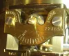 The shiny gold plating is in very good condition with virtually no wear, and the glasses are fine. The jeweled movement, #223655, and the round dial are pristine. The consignor claims that it runs well, powered by changes in temperature and barometric pressure,. Ht 9 1/4"