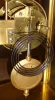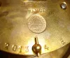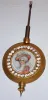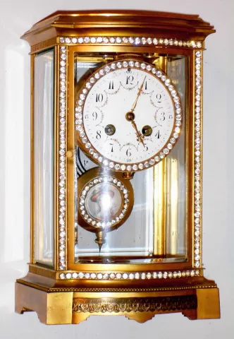 French brass and glass 8 day, time and strike bow-front rhinestone crystal regulator, c1890 The old gilt patina is very nice but nearly overwhelmed by all the sparkling rhinestones around the door, dial and pendulum. The top has fancy engraved initials. Except for two small chips in the bottom corners of the back door, the rest of the beveled glasses all are fine. The porcelain dial, with its multicolor floral garlands, has one small chip by the 11. The Marti 1889 Medaille d'Argent movement ticks and strikes but may need service. Ht 11 1/2"