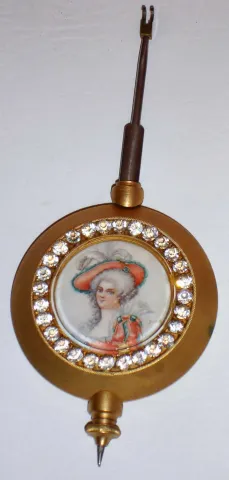 The old gilt patina is very nice but nearly overwhelmed by all the sparkling rhinestones around the door, dial and pendulum. The top has fancy engraved initials. Except for two small chips in the bottom corners of the back door, the rest of the beveled glasses all are fine. The porcelain dial, with its multicolor floral garlands, has one small chip by the 11. The Marti 1889 Medaille d'Argent movement ticks and strikes but may need service. Ht 11 1/2"