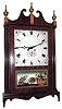 Elmer O. Stennes, Weymouth, Mass., "Pillar and Scroll", 8 day, time and bim bam strike, spring driven movement in a mahogany case with bird's eye maple highlights, reverse painted lower tablet and painted metal dial, c1965 the clock is in excellent original condition. The center plinth has an 1/8" break on the front. The lot includes the original card from Old Sturbridge Village, from where the clock was purchased, with notes by the original owner. Ht 30 1/2"
