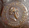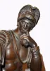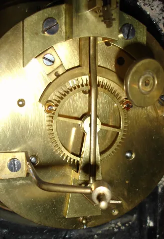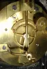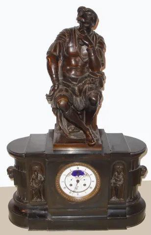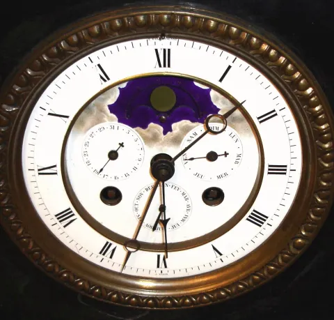 there are several chips and repairs to the marble case, and a small chip in the dial above the 12; tail to the seconds hand has broken away [in a bag]. The bronze is of the highest quality, and with its foundry mark "Reduction Mecanique, A Collas". The high quality movement has a 60 tooth escape wheel and brocot escapement on the rear plate and is thus able to show half seconds on the dial with one hand revolution per minute. Subsidiary dials in the center indicate day, date and month [correcting for short months] and also phases of the moon in a "penny moon" aperture. Note statue is now separate from base, could be re-attached by adding two studs to meet holes in case top. Ht 31"