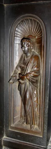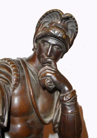French, Barbedienne, Paris, a large marble and bronze mantel clock with perpetual calendar, and surmounted by a Greek warrior with a lions head helmet, and showing phases of the moon and center seconds, the dial flanked by two robed clerics or philosophers, and the case ends with busts of Socrates on one side and Aristotle on the other. /with damage, c1875 there are several chips and repairs to the marble case, and a small chip in the dial above the 12; tail to the seconds hand has broken away [in a bag]. The bronze is of the highest quality, and with its foundry mark "Reduction Mecanique, A Collas". The high quality movement has a 60 tooth escape wheel and brocot escapement on the rear plate and is thus able to show half seconds on the dial with one hand revolution per minute. Subsidiary dials in the center indicate day, date and month [correcting for short months] and also phases of the moon in a "penny moon" aperture. Note statue is now separate from base, could be re-attached by adding two studs to meet holes in case top. Ht 31"