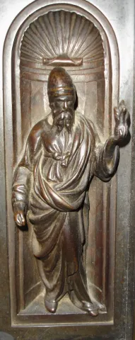 French, Barbedienne, Paris, a large marble and bronze mantel clock with perpetual calendar, and surmounted by a Greek warrior with a lions head helmet, and showing phases of the moon and center seconds, the dial flanked by two robed clerics or