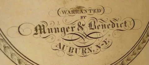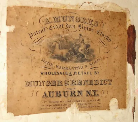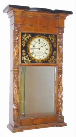 Munger and Benedict, Auburn, NY, 8 day, time and strike, Ironing board top carved column shelf clock, c1832. Mahogany and mahogany veneered case in in old finish. There is a small piece missing on the right side base molding and the left as well. A small piece on the underside left side ironing board top. Original tablet has a crack in the lower right corner. Original signed dial is very nice. Hands and eagle pendulum are original. Period mirror. Original wall paper backing inside the case and very clean label. Two of the four pulleys are original. Ht 38 3/4"
