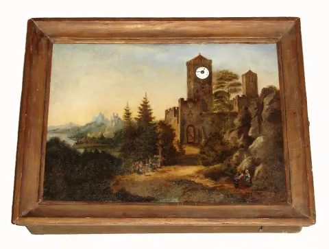 Picture clock with oil on zinc painting of castle scene inset with Continental rear wind, silk thread suspension movement in castle tower, spring driven with white enamel Roman numeral dial. The painting has a smooth molded frame, c1820 the painting is in good condition. The dial has a couple of tiny flakes on it. This is a two day duration clock which has recently been professionally cleaned and overhauled. Ht 15" x Wdth 20"