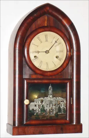 Forestville Manufacturing Co., J.C. Brown, Bristol, Conn., "Miniature Beehive" mantel clock, 30 hour, time and strike, spring driven movement in a mahogany veneer case with silk screen lower tablet and painted metal dial; tablet of Hartford, CT state house (still standing), c1850 the case retains its original finish, nicely rubbed down with minor veneer flakes on bottom return moldings and a 1 3/4" x 1/4" strip of wood missing from top rear of case. The original ivory door pull is in good condition. There is some touch up on dial. The lower tablet with some flaking. Ht 15 1/2"