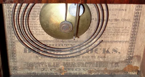 Forestville Manufacturing Co., J.C. Brown, Bristol, Conn., "Miniature Beehive" mantel clock, 30 hour, time and strike, spring driven movement in a mahogany veneer case with silk screen lower tablet and painted metal dial; tablet of Hartford, CT state