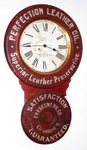 Baird Clock Co., Plattsburg, NY, 8 day advertising time piece for "Perfection Leather Oil". The movements for these time pieces were supplied by Seth Thomas, c1895.