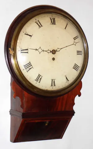 English, 8 day cable drive fusee tavern or round drop dial mahogany wall time piece, c1780. Mahogany and mahogany veneered oak case in an old finish. The small area of the veneer next to the left ear just below the dial is worn through to the base probably from someone who sanded it a little too much. The numbers and part of the chapter ring on the original painted convex dial have been restored, but a little rough. Hands are original. The molded edge on the bottom access door is worn a little with use. Movement is mounted to a false plate that is mounted to a wood back plate for the metal dial. Ht 22 1/4"