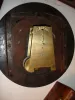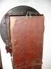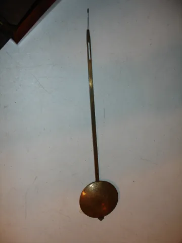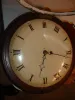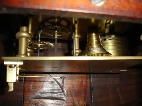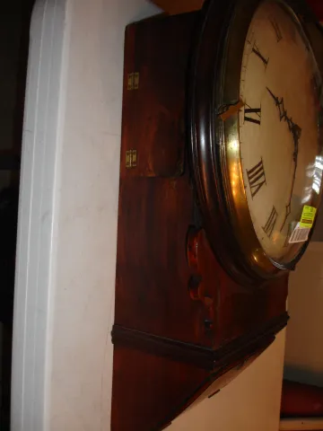 Mahogany and mahogany veneered oak case in an old finish. The small area of the veneer next to the left ear just below the dial is worn through to the base probably from someone who sanded it a little too much. The numbers and part of the chapter ring on the original painted convex dial have been restored, but a little rough. Hands are original. The molded edge on the bottom access door is worn a little with use. Movement is mounted to a false plate that is mounted to a wood back plate for the metal dial. Ht 22 1/4"