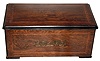 the mechanism was professionally restored in 1998 and is running well at the time of cataloging. The case is in good original condition with a veneer chip to inlay on lid. The rear left foot is an appropriate replacement. Ht 10", Wdt 20 3/4", Dpth 11 1/2"