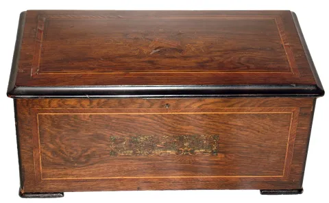 Swiss music box with multi-tune cylinder, 63 tooth comb, movement playing on six bells and a drum with eight hammers housed in inlaid rosewood case, c1880 the mechanism was professionally restored in 1998 and is running well at the time of cataloging. The case is in good original condition with a veneer chip to inlay on lid. The rear left foot is an appropriate replacement. Ht 10", Wdt 20 3/4", Dpth 11 1/2"