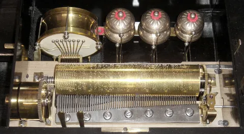 Swiss music box with multi-tune cylinder, 63 tooth comb, movement playing on six bells and a drum with eight hammers housed in inlaid rosewood case, c1880