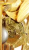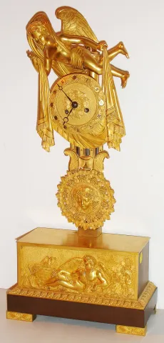 French mantel clock, 8 day, time and strike, pendule a Paris movement, with recoil escapement and count wheel, signed "Chappe a Paris", the gilt bronze case with winged figure, holding drapes on either side of the gilt Roman numeral dial with grape and leaf ornament, blued steel Breguet style hands, simulated gridiron pendulum in gilt bronze and polished steel, pendulum also with grapes and leaves theme surrounding a female bust, the base with reclining winged figure, a pair of doves, and more grapes, on a red patinated plinth supported by palm decorated gilt feet, c1825, Case is very good overall, with minimal loss to gilding, and quite clean, minor evidence of oxidation on steel parts of pendulum, with evidence of abrasive removal, pendulum hook soldered to rod, time and strike trains functional, movement is loose, and will need to be secured prior to running, the mounting bracket is between the movement and dial, bell nut replaced, minute hand with repair to tip. L 9 3/4" W 4 3/4" Ht 21" A very unusual and attractive clock