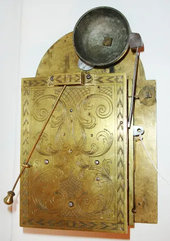 Austria, miniature quarter striking and repeating bracket clock movement with verge escapement, probably of two day duration, time side with fusee, strike with going barrel, strike and repeat on a single bell, back plate with engraving, baluster shaped pillars, brass composite dial with Roman numerals, Arabic five minute markers, and engraved decoration, mock pendulum displayed below 12, strike/ night strike indicator in arch, steel hands, c1770 Movement running, strike and repeat function, but will require adjustment to correctly indicate the hours and quarters, dial polished, steel hands missing much of their blue, Ht 7 3/4" to top of dial