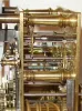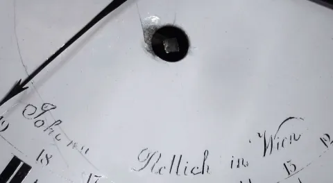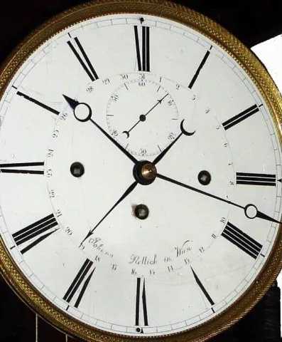 Austrian, floor clock or Bodenstanduhr, now with longer running, 3-wt Grand Sonnerie, with seconds hand and central calendar, the dial signed Johann Nellich in Wien, in a 6- light case of provincial origin, with meter length grid pendulum, c1800 the 3-train movement [geared for 30 days] is of exceptional quality with thick plates, 6 well shaped baluster pillars, and unusual front suspended knife edge pendulum. Note the pendulum bob is old, the grid section restored. The 3 large star pulleys are original and of very fine quality. The case is well made, and with some restoration, top door latch and hinges appear new, otherwise old. A pair of risers accept the seat board for the movement. Proper movement from the same time period fits case well. Dial with chip at central winding hole, and some up to signature. Ht 81.5"