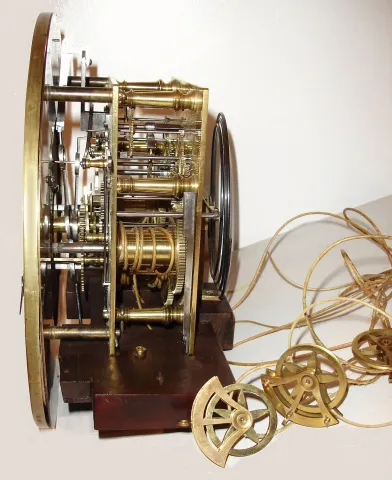 the 3-train movement [geared for 30 days] is of exceptional quality with thick plates, 6 well shaped baluster pillars, and unusual front suspended knife edge pendulum. Note the pendulum bob is old, the grid section restored. The 3 large star pulleys are original and of very fine quality. The case is well made, and with some restoration, top door latch and hinges appear new, otherwise old. A pair of risers accept the seat board for the movement. Proper movement from the same time period fits case well. Dial with chip at central winding hole, and some up to signature. Ht 81.5"