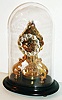 Brass plates with some minor spotting and discoloration, escapement functional and with power, movement should be serviced, dial very good with some fine spotting, and some loss to black paint on numerals, hands good, the hour with minor rust, pendulum with a few minor dents, one wrinkle and scattered spotting, wooden base refinished, and with separation at the glue joints, glass dome very good Ht 13 1/4"