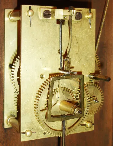 This timepiece has a good look. Top glass has been repainted on old glass. Mirror is an old replacement. The case contains a period banjo type movem...
