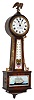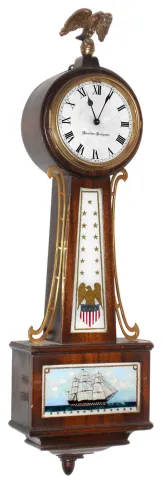 Hamilton Sangamo mahogany electrically-wound striking banjo clock, naval tablets, c1931 the heavy case is in very good original condition including nice dial, rear label and maker's plate, with lower glass tablet portraying the U.S.S. Constitution. These 'hybrid' movements used high quality balance wheel units wound with 110V current; we have not tested this one but the plug and wires are in place. Expensive when new. Ht 29"