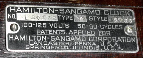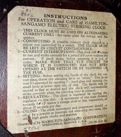 the heavy case is in very good original condition including nice dial, rear label and maker's plate, with lower glass tablet portraying the U.S.S. Constitution. These 'hybrid' movements used high quality balance wheel units wound with 110V current; we have not tested this one but the plug and wires are in place. Expensive when new. Ht 29"