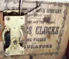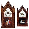 both clocks have old painted metal dials, partial labels, and some veneer losses. The smaller has a great painted tablet showing children and a parro...