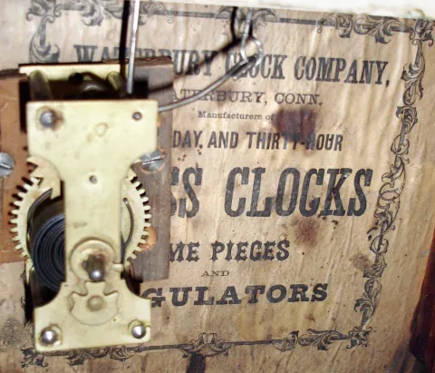 Clocks- 2 (Two) Waterbury Clock Co., Waterbury, Conn., 30 hour mahogany steeple clocks: one time, strike and alarm; one miniature time and alarm, late 19th century