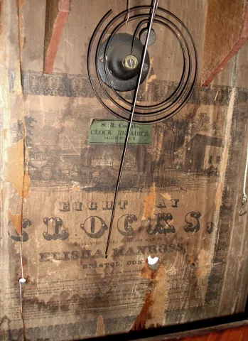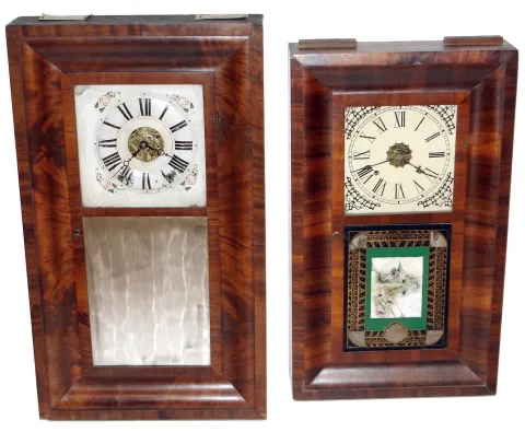 Clocks- 2 (Two) mahogany time and strike weight-driven OG shelf clocks: Waterbury 30 hour; Manross 8 day; mid 19th century both cases are in nice condition, with minor veneer losses and partial inside labels. The smaller has a newer dial and cracked lower tablet; the mirror tablet in the 8 day is old and wavy. Hts 29.5" and 26"