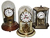 the Barr is in excellent cosmetic condition with glossy brass, turned wood base, and clean dial, Ht 12.5" to dome top. The larger anniversary clock, with "KS" trademark, has some spotting to its white floral painted base and dial, Ht 11.5". The smaller 6-sided tarnished brass case has 2 floral etched glasses, and movement marked "Hall Craft Corp", Ht 10"