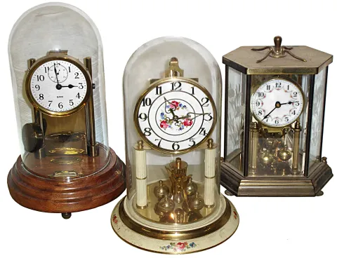 Clocks- 3 (Three): Barr electrical impulse, Weedsport, N.Y.; 2 German 400 day; 20th century the Barr is in excellent cosmetic condition with glossy brass, turned wood base, and clean dial, Ht 12.5" to dome top. The larger anniversary clock, with "KS" trademark, has some spotting to its white floral painted base and dial, Ht 11.5". The smaller 6-sided tarnished brass case has 2 floral etched glasses, and movement marked "Hall Craft Corp", Ht 10"