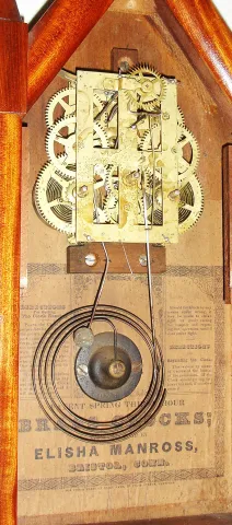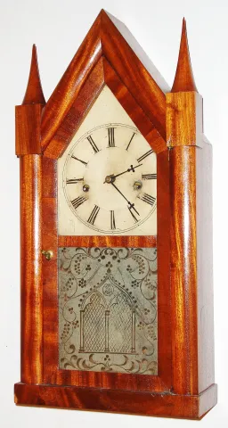 Elisha Manross, 30 hour, time and strike, steeple or sharp gothic mantel clock, c1850 Refinished mahogany veneered case with a couple of chips on the base and small piece missing at the top hinge. Original painted dial with some wear and minor loss at the mounting pins and at the winding arbors. Original frosted tablet. Movement retains original brass springs. Clean label inside case. Ht 19.5"