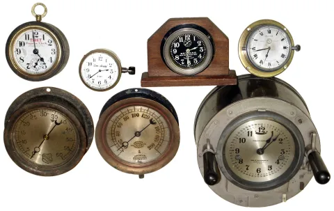 Clocks and gauges- 7 (Seven): Calculagraph; 2 pressure indicators; Tidey furnace clock; and 3 auto clocks, early 20th century