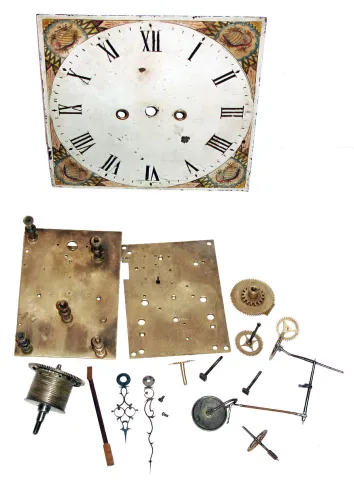 English tall clock parts lot with painted iron square dial and brass movement in pieces