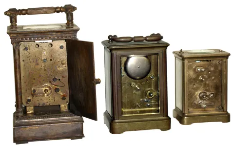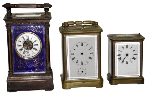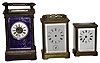 Clocks- 3 (Three) Carriage clock, 8 day. brass and glass timepieces: large Chinese with porcelain panels; French with alarm; small French; 20th century the Chinese is a modern reproduction, made to look old, with colorful cobalt-blue panels on 3 sides, dark finish, and lever platform, Ht 8". The alarm model, in its Cornish case, has good beveled glasses and white porcelain dial, cylinder platform, but missing hour and minute hands, Ht 7". The smallest also has good glasses and white porcelain dial, but is missing its top handle, rear door, hour hand, and entire balance platform, Ht 4"