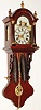 Reproduction small Dutch hood clock, German, 8 day, time and strike, weight driven movement dated 1984 the painted dial is pretty, and the stained wood case is well made but has some scuffs and scratches. The large iron pine cone weights are not original - should be brass or brass covered. The chains have some oxidation, and empty holes in the front panel indicate that some decorative element is absent. Mov't sgned Hermle. Ht of case 27"
