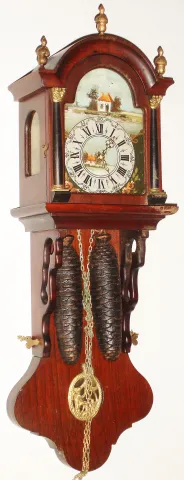 Reproduction small Dutch hood clock, German, 8 day, time and strike, weight driven movement dated 1984